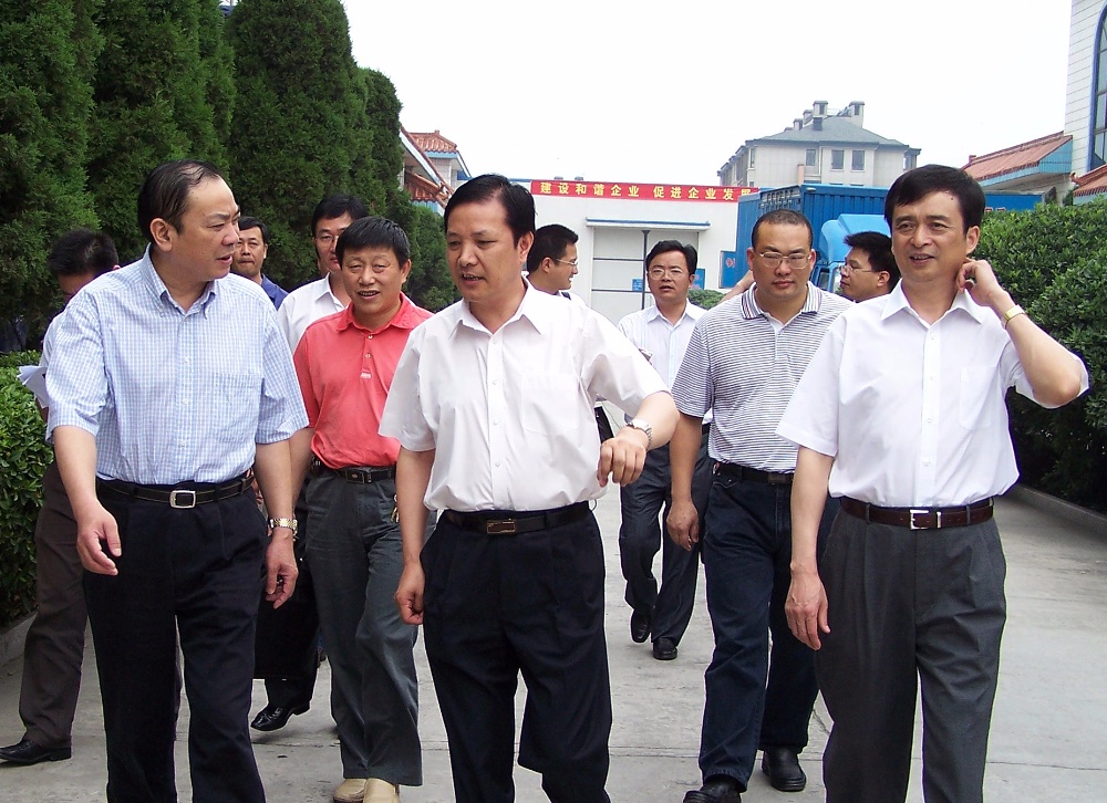 中宣部常务副部长、中央文明办主任(时任中共嘉兴市委书记)黄坤明(左一)在浙江宏达经编有限公司指导工作