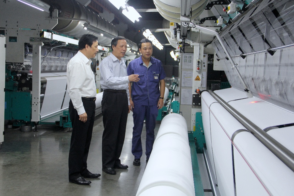 原中共嘉兴市委常委、嘉兴市副市长(时任中共海宁市委书记)沈雪康(左)在许村经编厂指导工作