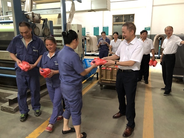 公司领导们,来到染整二部、染整一部等部门,向在高温天气中坚守岗位的一线员工表示亲切的慰问和感谢。在生产现场,嘱咐大家高温生产不忘安全,做到劳逸结合;也要求各部门切实做好防暑降温工作,保障员工健康安全。
