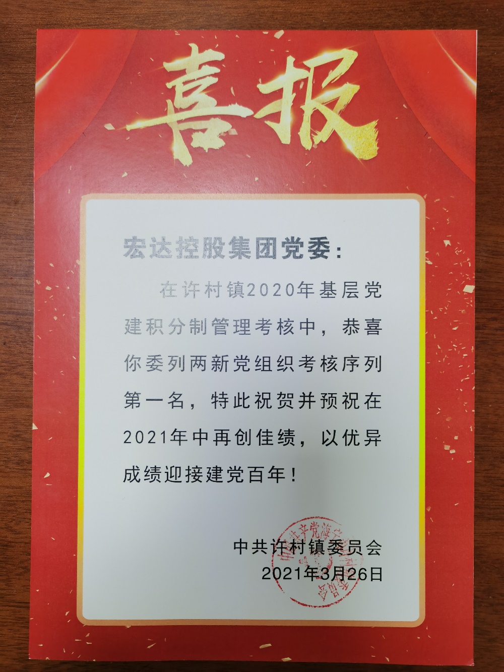 宏达控股集团党委在许村镇2020年度基层党建积分制管理考核中委列两新组织考核第一名。