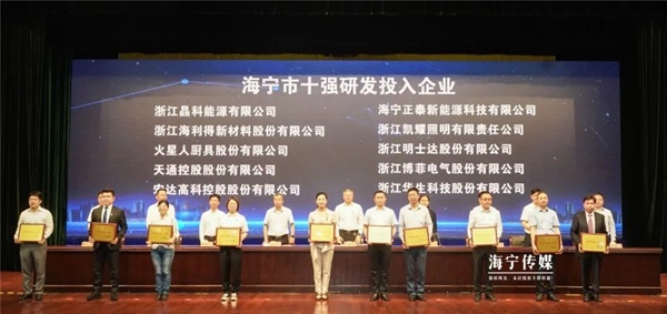 在5月26日举行的“才聚潮城·科创海宁”2021年海宁市人才科技创新暨高质量发展大会上,宏达高科被评为海宁市十强研发投入企业。