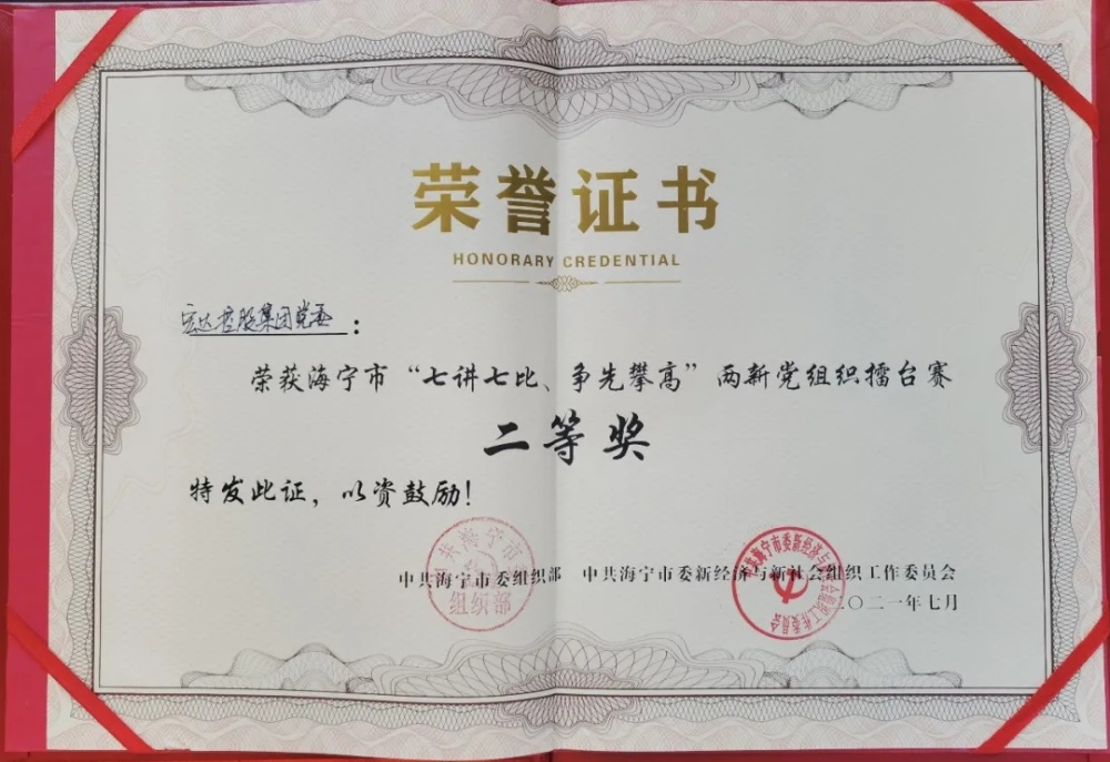 为深入学习贯彻习近平新时代中国特色社会主义思想,大力弘扬“红船精神”,进一步深化党建高地创建,2021年7月29日下午,在有近300人参加的两新组织书记(党务工作者)培训班上,海宁市委组织部举办了“七讲七比、争先攀高”两新党组织擂台赛。行政支部许铨代表宏达集团党委参赛,荣获二等奖。