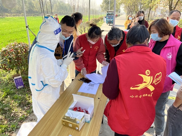 织造支部党员沈海燕,连续6天早点6点到11点,在许桥村群义组核酸检测点,协助村民登记信息,检查健康码。