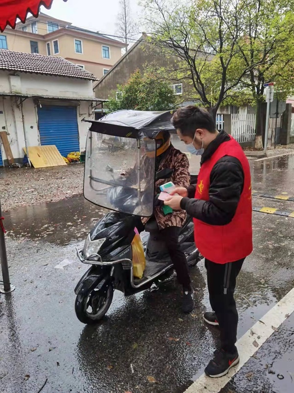 织造支部党员封亚鸿,连续7天早上8点到下午4点在许巷村木桥组卡点进行志愿者守门,保证区域范围人员不进不出,居家隔离。