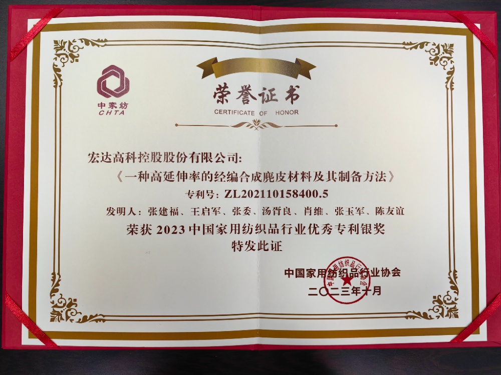 为激发行业创新活力,挖掘行业创新潜能,2023年10月,中国家用纺织品行业协会相继开展了2023年家纺行业优秀“科技+家纺”论文(案例)征集活动、2023年中国家纺行业优秀专利征集活动,经评选,宏达高科控股股份有限公司提交的《一种高延伸率的经编合成麂皮材料及其制备方法》专利荣获“2023中国家用纺织品行业优秀专利银奖”。