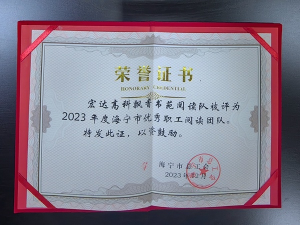 4月8日,“工会向潮•悦读相伴”海宁市职工有声书屋建设现场会暨海宁市第七届职工文化艺术节开幕式在盐官镇举行,宏达高科控股股份有限公司在会上被评为海宁市“书香企业”,“宏达高科”飘香书苑职工阅读团队被评为2023年度海宁市优秀职工阅读团队。