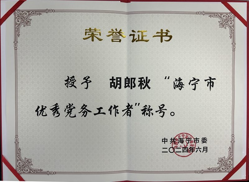 6月27日上午,海宁市召开庆祝中国共产党成立103周年暨“两优一先”表彰大会,胡郎秋同志在会上获评“海宁市优秀党务工作者”。