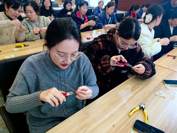 课堂上,海宫的专业老师拿起制作材料,向女职工们演示手串制作。现场女职工们面前摆放着手串的制作材料,以及珠宝钳等制作工具。在老师的耐心指导下,大家纷纷制作起了手串,感受手工带来的魅力。