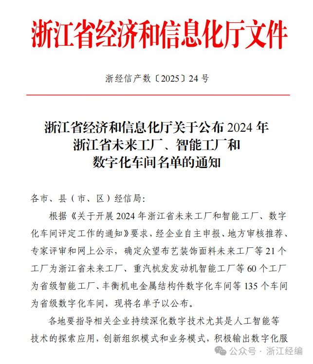 1月18日,浙江省经济和信息化厅对2024年浙江省未来工厂、智能工厂和数字化车间名单进行了公布,宏达高科环保型高档车用内饰面料数字化车间获评省级数字化车间。