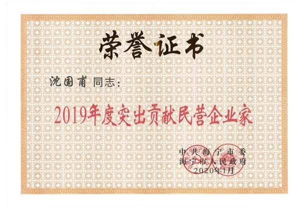 2020年3月8日,海宁市“工业强市 向高质量前进”暨全市三级干部大会隆重召开,会议表彰了2019年度为全市经济社会发展作出突出贡献的企业和个人。宏达集团董事长沈国甫荣获海宁市“突出贡献民营企业家”称号。