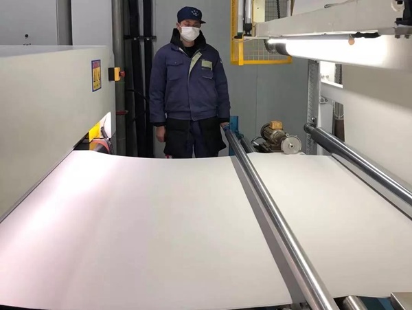 复工当天,车间内,只见员工们戴着口罩在生产线上忙碌。由于生产设备高度自动化,一名员工可以看管5至6台设备,因此车间内人员并不密集,生产也是井然有序。正在生产的这批汽车顶蓬面料,后天将发给客户,以满足客户的需求。公司副总经理孙云浩表示,公司目前已开启织造和复合两条生产线,等集中供热启动后,公司染整生产线也将恢复生产;后续将根据产业链上游的供应情况和下游的客户需求情况逐步提升产能,争取在15日全部恢复生产。