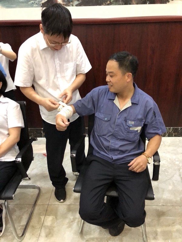 此次培训由海宁市红十字会的两名培训讲师主持。上午,通过多媒体放映的形式,为学员们讲解了红十字以及一些常用的急救知识,包括骨折的固定与搬运、止血的基本常识、现场急救心肺复苏、人工呼吸等;随后运用人体模型,进行现场演示教学;邀请学员进行现场实操,了解突发事故的现场救助流程;安排了互动环节,学员们积极提问,讲师们耐心回答,现场气氛活跃。下午进行了考试。经两名培训师确认,参加本次培训的学员考试全部合格,均可获得“红十字救护员证”。
