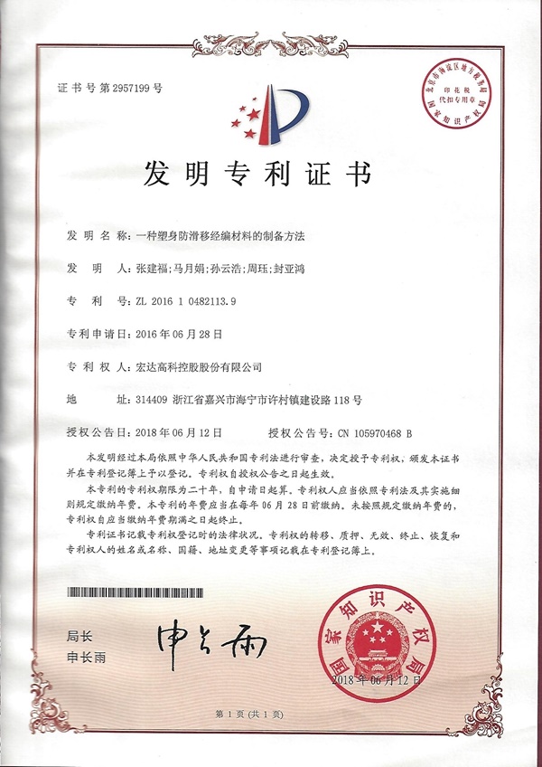 据了解,本次“宏达高科”获得专利的发明内容是:一种塑身防滑移经编材料的制备方法;运用本专利所制备的运动服饰面料,其氨纶弹性纤维面与人体接触时对皮肤具有一定的黏附性,能减小运动时服饰面料的滑移,从而减小摩擦;又因该面料拉伸弹性大,能对人体肌肉有一定的压力、起固定作用,因此还能有效防止运动时造成的肌肉、关节受伤,减轻运动人员的肌肉疲劳度,提高运动塑身的效率和效果。另外2项获得的外观设计专利,是对公司自主开发的两种汽车内饰面料进行的外观设计专利保护。