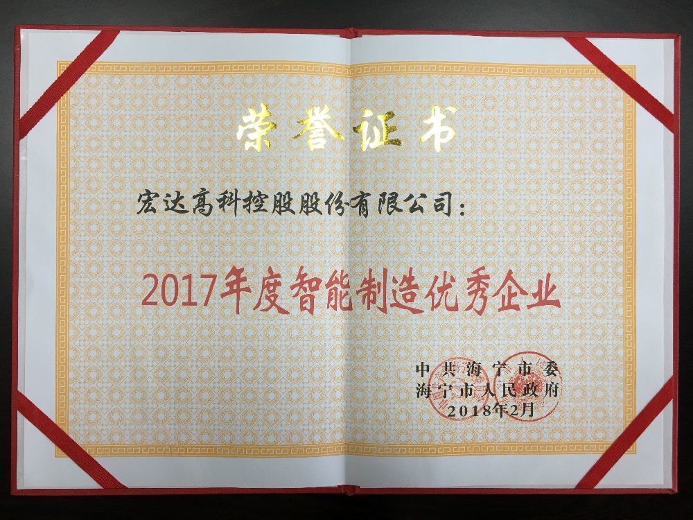宏达高科荣获“2017年度智能制造优秀企业”这和公司一直以来的努力分不开,过去一年,公司坚持机器换人、转型升级,智能制造,发扬敢为人先、持续奋斗的精神,不断引进国内外先进设备,全面推动公司向国际化、现代化、专业化、品牌化、信息化、智能化企业发展,为促进海宁市纺织工业智能化转型升级做出贡献。