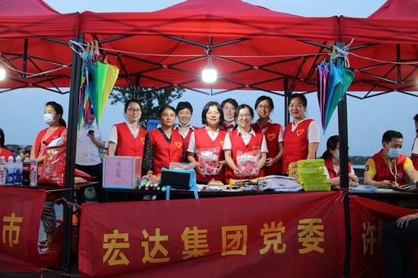 2020年6月1日傍晚,海宁市许村镇许村社区联合共建单位党组织、爱心企业、社会组织等多方力量,在许村龙渡湖广场开展了一场以“关爱生命、无偿献血、爱心接力”为主题的公益集市活动,宏达控股集团党委作为共建单位,派出了10余名党员参与活动。