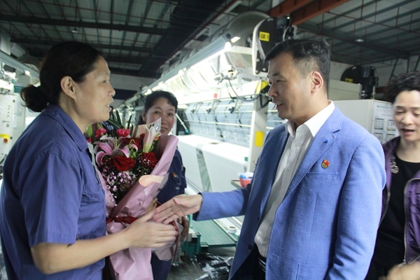 2019年4月26日上午,许村镇党委副书记朱洪海在许村镇工会主席李瑞仙的陪同下,来到宏达高科走访慰公司劳动模范,为他们送上慰问金,祝福他们过一个快乐祥和的节日。 在宏达高科,朱书记来到经编车间,慰问了全国劳动模范何娟凤、嘉兴市、海宁市劳动模范赵巧娟。何娟凤和赵巧娟都是宏达高科的普通一线员工。十几年来,她们在岗位上勤勤恳恳、苦练技能。其中赵巧娟曾被评为全国纺织工业技术能手,也是嘉兴市最美职工。朱书记说,这样的荣誉来之不易,并勉励她们在岗位继续努力,进一步弘扬工匠精神。